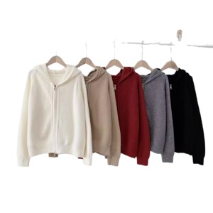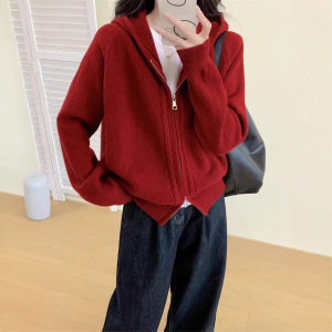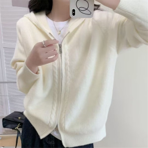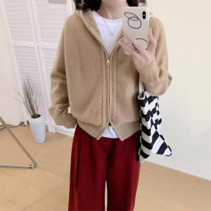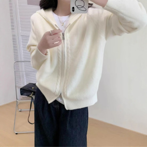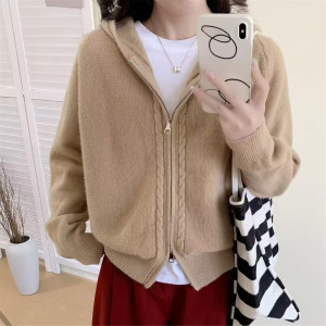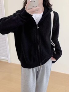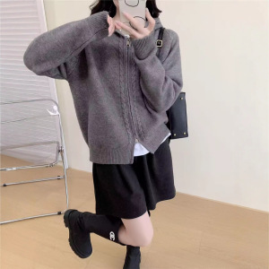 韩版宽松慵懒风连帽双拉链针织开衫女2025秋冬季新款毛衣外套上衣