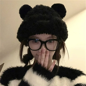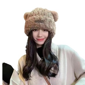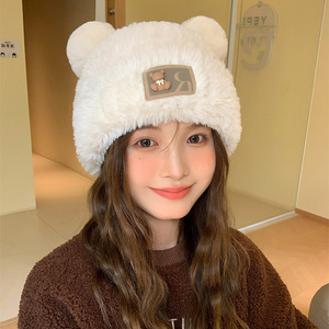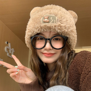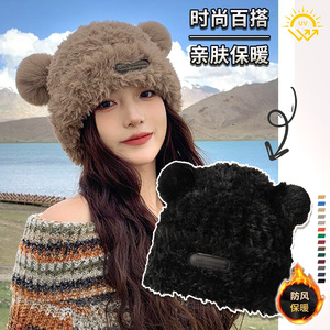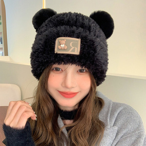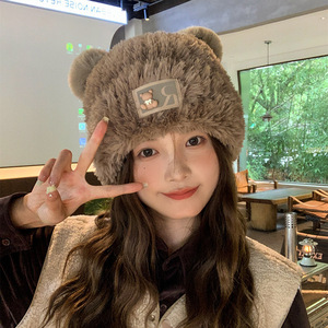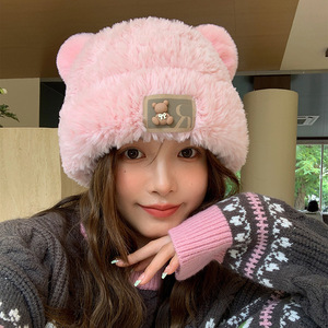 2025秋冬时尚大头围毛线针织帽子女可爱小熊毛绒帽保暖护耳包头帽