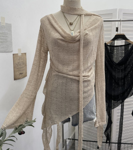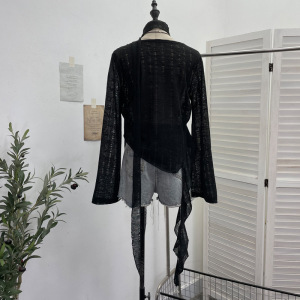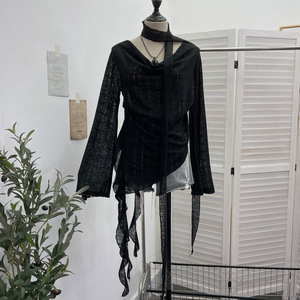 实拍 废土风不规则飘带镂空洞洞针织衫上衣荡领宽松长袖T恤衫9277