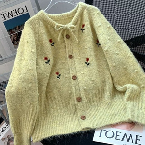 温柔风甜美绣花毛衣外套女秋冬2025新款韩系蝴蝶结针织开衫上衣服