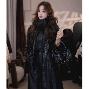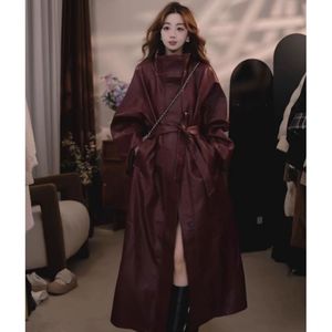 立领感皮衣外套中长款女2025秋冬气质系带复古红色风衣大衣