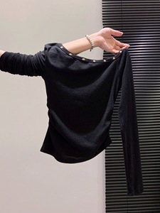 斜领露肩铆钉长袖t恤打底衫女2025早秋新款掐腰显瘦辣妹短款上衣