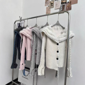 跨境新款秋冬海军领韩版时尚针织开衫女软糯小香风飘带毛衣外套女