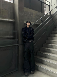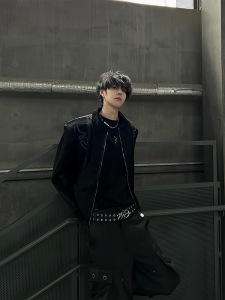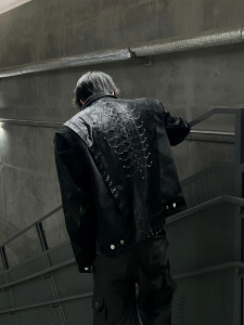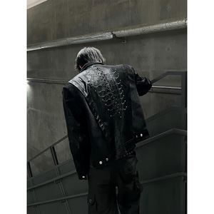 cleanfit蛇瞳脊骨黑色短款外套男款春秋蛇纹拼接铆钉刺绣翻领夹克