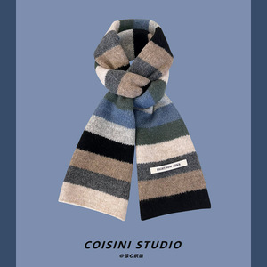 温柔系~韩版羊毛撞色条纹围巾女秋冬保暖百搭学生情侣针织小围脖