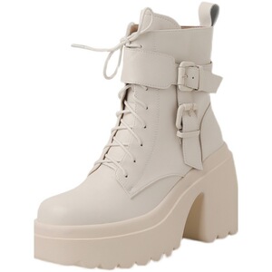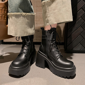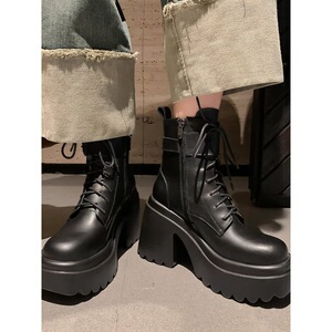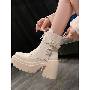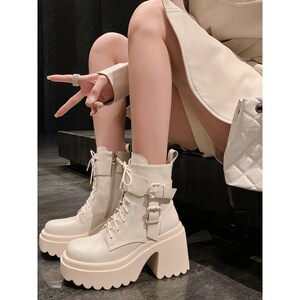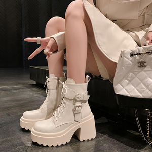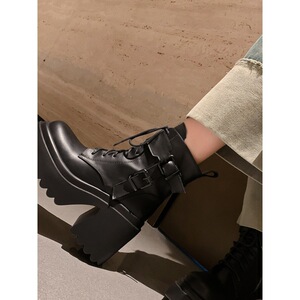 小个子增高超高跟短靴女秋冬新款松糕厚底靴子防水台皮带扣马丁靴