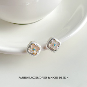 银色拉丝天然贝母四叶草绿松石耳钉女轻奢精致高级感时尚百搭耳饰