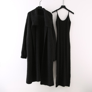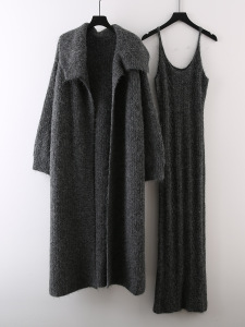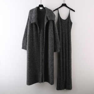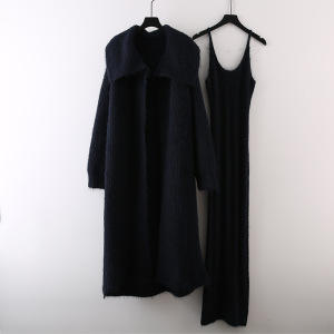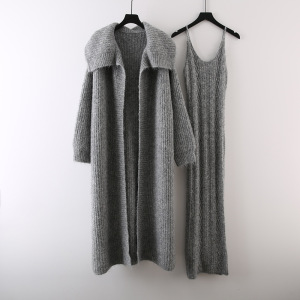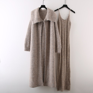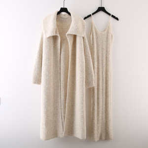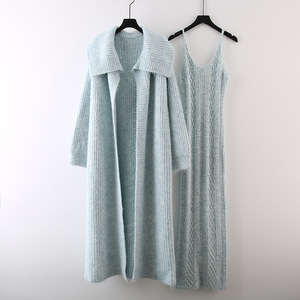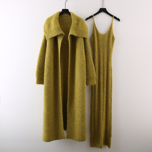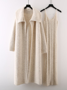 慵懒风翻领大衣秋冬女加厚大毛衣外套中长款针织开衫吊带长裙套装