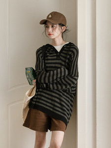 实拍 2025秋季新款日系复古学院风宽松慵懒连帽条纹针织衫女上衣