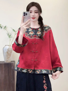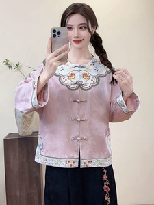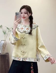 2025秋款国风女装镶边撞色翻边长袖民族风宽松刺绣女士外套