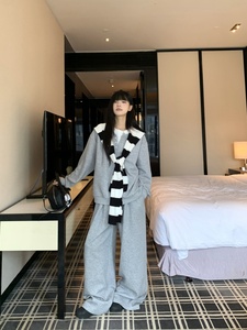 灰色卫衣套装慵懒风条纹披肩女秋季休闲裤阔腿裤慵懒松驰感三件套