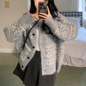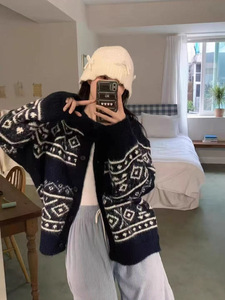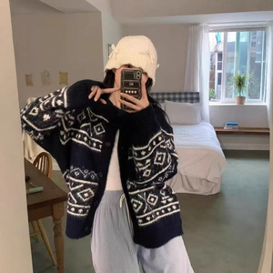 秋冬新款韩版设计感圆领套头复古提花撞色毛衣女针织衫开衫女毛衣