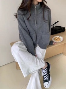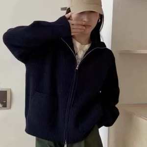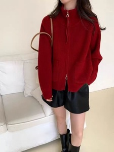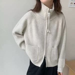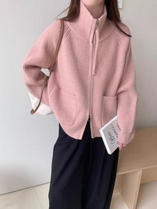 2025秋冬新款立领双拉链长袖宽松大码慵懒风毛衣女装针织开衫外套