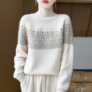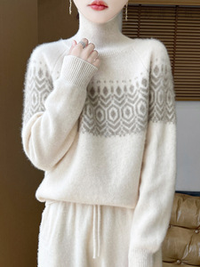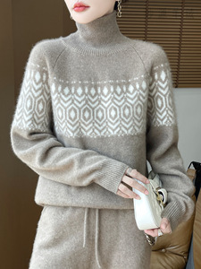 高领双股加厚羊毛衫女新款提花撞色毛衣长袖套头慵懒风洋气羊毛衫