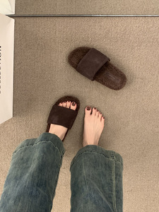BEILIXUAN 牛皮百搭厚底毛毛拖鞋女外穿秋冬仙女风休闲羊羔毛一字