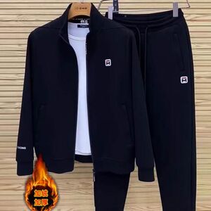男士加绒休闲运动服套装秋款两件套潮牌立领外套长袖长裤工装套装