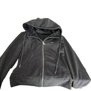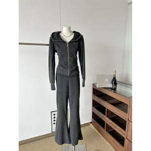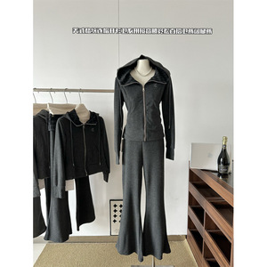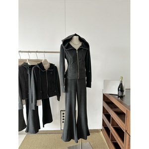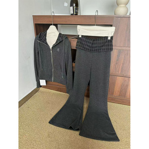 塞纳美式格纹连帽开衫卫衣拼接高腰宽松百搭卫裤阔腿裤套装