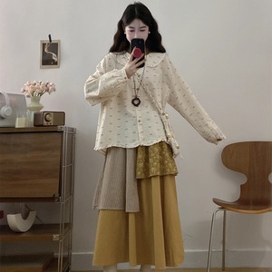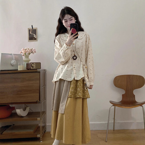 大码胖mm森系娃娃领印花棉布衬衫+拼接高腰半身裙两件套