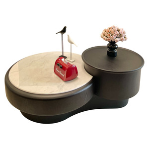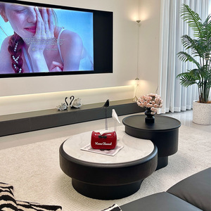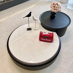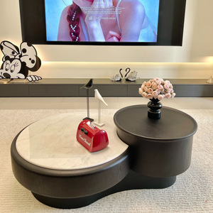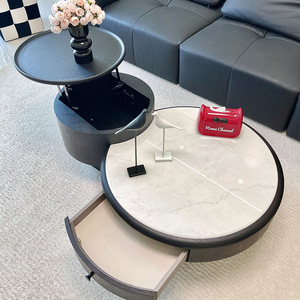 意式极简黑色复古风大小茶几组合圆形木纹茶桌家用小户型伸缩储物