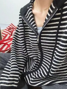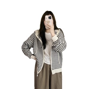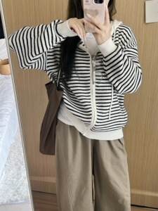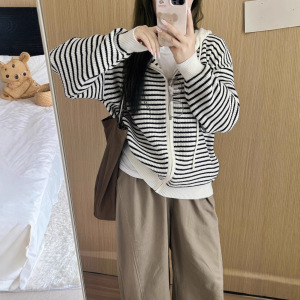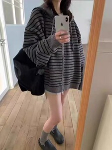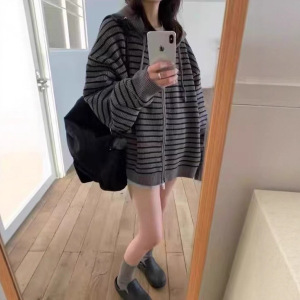 2025年韩系慵懒风撞色条纹连帽毛衣外套女秋冬季宽松拉链针织开衫