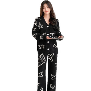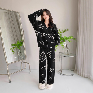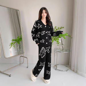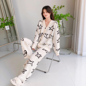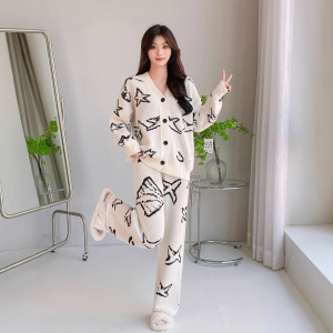 新款宽松保暖半边家居服秋季珊瑚绒针织衫短袖圆领毛衣套装高级