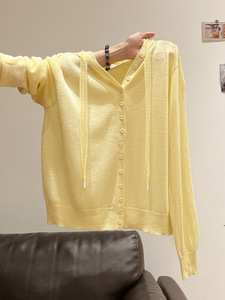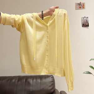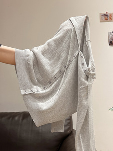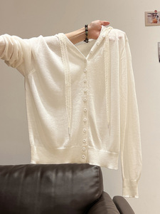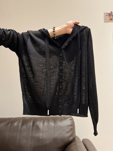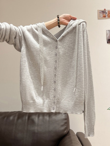 灰色微透连帽设计感长袖针织开衫女2025秋季新款薄款外套短款上衣