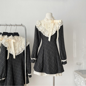 尤莉少女长袖版 法式复古格纹蕾丝边收腰千金风连衣裙女