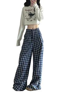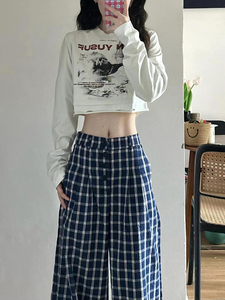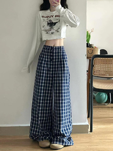 韩系复古蓝色格子阔腿裤女夏季薄款慵懒风休闲高腰宽松拖地长裤子