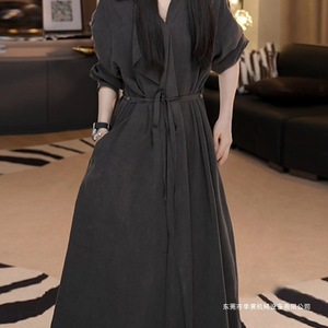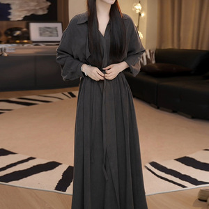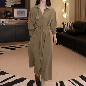 法式赫本风优雅减龄长袖连衣裙秋季新款收腰显瘦系带POLO领中长裙