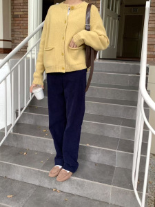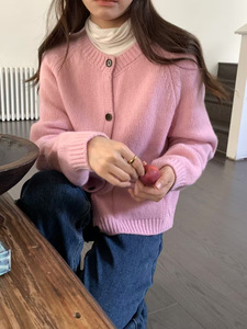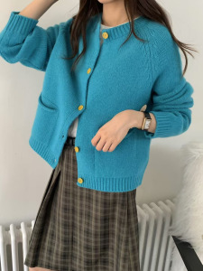 毛衣宽松慵懒女圆领纯色百搭宽松韩系卷边口袋毛衣针织开衫A7024