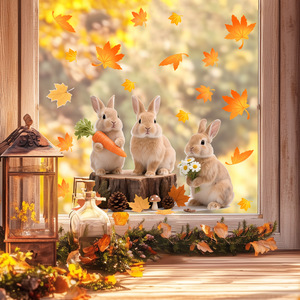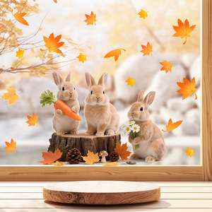 跨境亚马逊创意秋天兔子枫叶静电玻璃贴卧室玻璃窗户家居装饰贴纸
