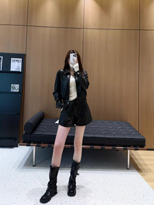 2025年早秋Miu*新款字母刺绣翻领长袖PU皮衣搭配真皮拼接短裤套装