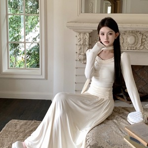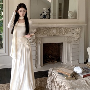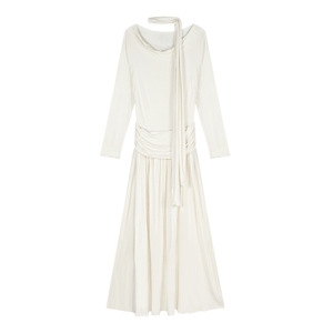 法式温柔荡领长袖针织连衣裙女秋季修身气质长裙飘带收腰a字裙子