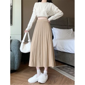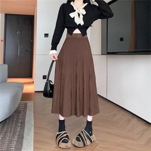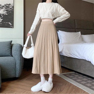 韩系时尚针织半身裙女秋冬新款百褶a字裙菱形提花垂感高腰中长裙