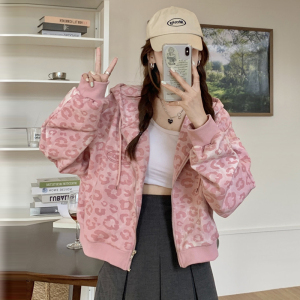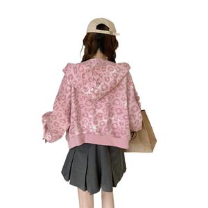 粉色豹纹短款拉链开衫外套女秋款薄款宽松港风复古连帽卫衣ins潮