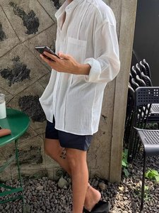 立领棉麻衬衫男慵懒松弛感宽松长袖防晒开衫亚麻肌理感工装衬衣潮