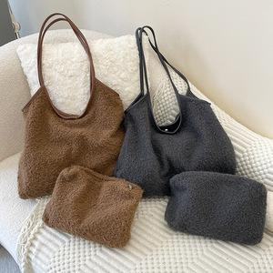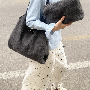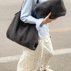 个性秋冬大容量百搭ins慷懒风洋气小众毛绒呢子单肩腋下托特大包