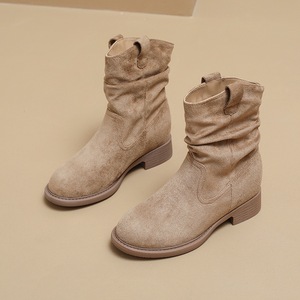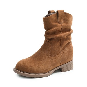 粗跟短靴女2025秋冬新款英伦圆头堆堆靴绒面套脚女式靴子现货批发