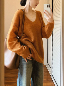 橙色v领秋冬慵懒风针织衫25新款宽松显瘦复古百搭毛衣衬衫长袖女