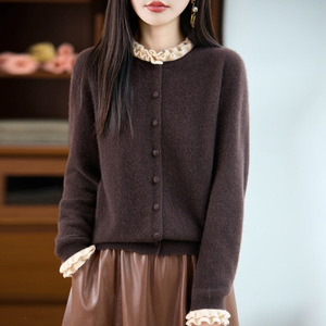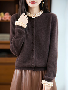 2025年秋冬新款纯羊毛木耳边圆领针织开衫长袖女包扣拼色保暖上衣
