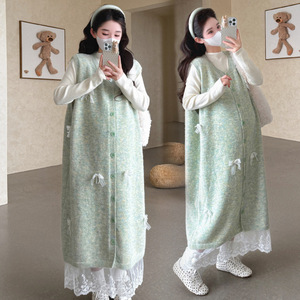 孕妇装秋冬套装新品减龄半高领上衣+韩版拼接蕾丝马甲裙两件套女