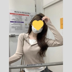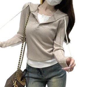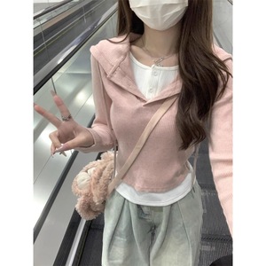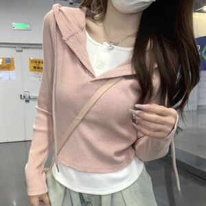 纯欲风拼接撞色假两件连帽长袖恤女秋冬季小众设计感修身上衣服