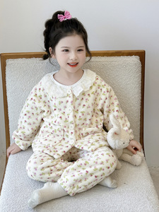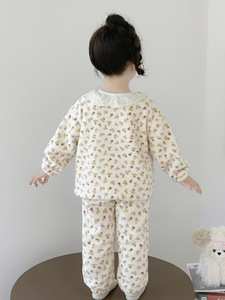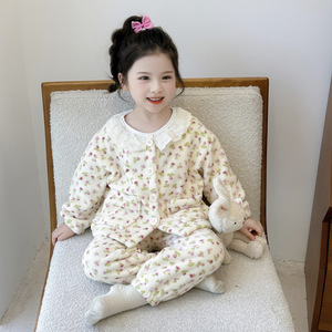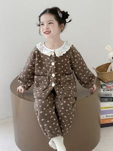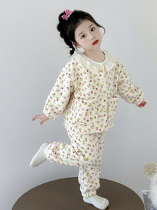 女小童睡衣套装2025新款秋冬儿童保暖花边领口袋家居服宝宝两件套