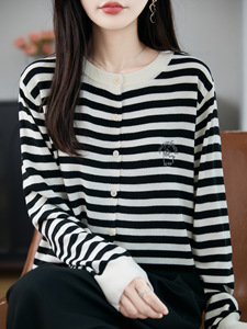 秋冬新款条纹针织开衫女圆领长袖打底上衣宽松刺绣百搭简约外套