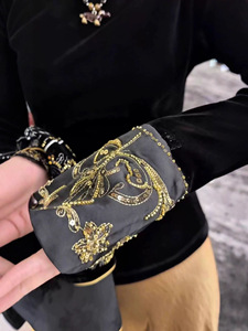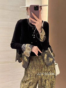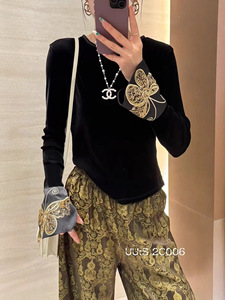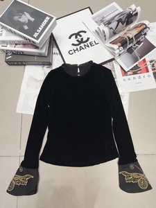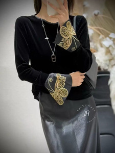 金蝶缝珠袖复古国风大气百搭修身黑色圆领秋季内搭上衣丝绒小衫
