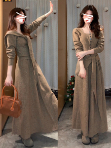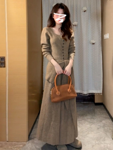 法式复古方领针织连衣裙子女早秋2025新款小香风气质长裙一整套装