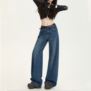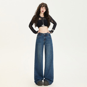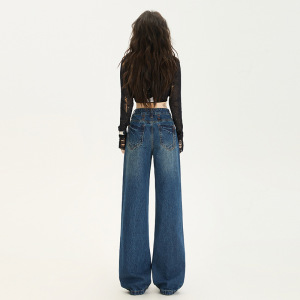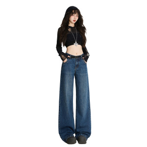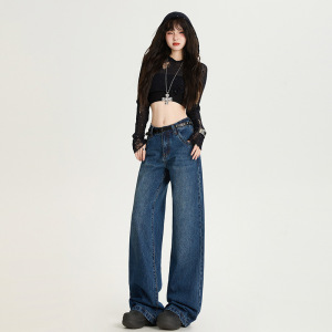 复古做旧水洗女士低腰牛仔裤秋冬新款美式宽松阔腿裤显瘦直筒裤子