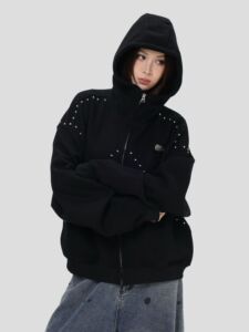 秋冬新款国潮情侣美式「拼接铆钉拉链卫衣」男女宽松连帽开衫外套