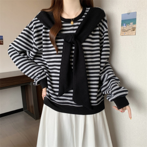 2025韩版披肩条纹长袖圆领卫衣女装秋季2025新款大码胖mm遮肚上衣
