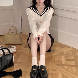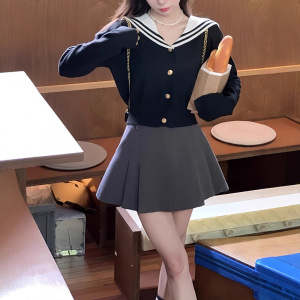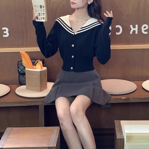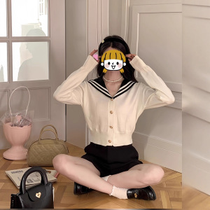 法式撞色海军领针织开衫女春秋季学院风设计感小个子高腰短款上衣